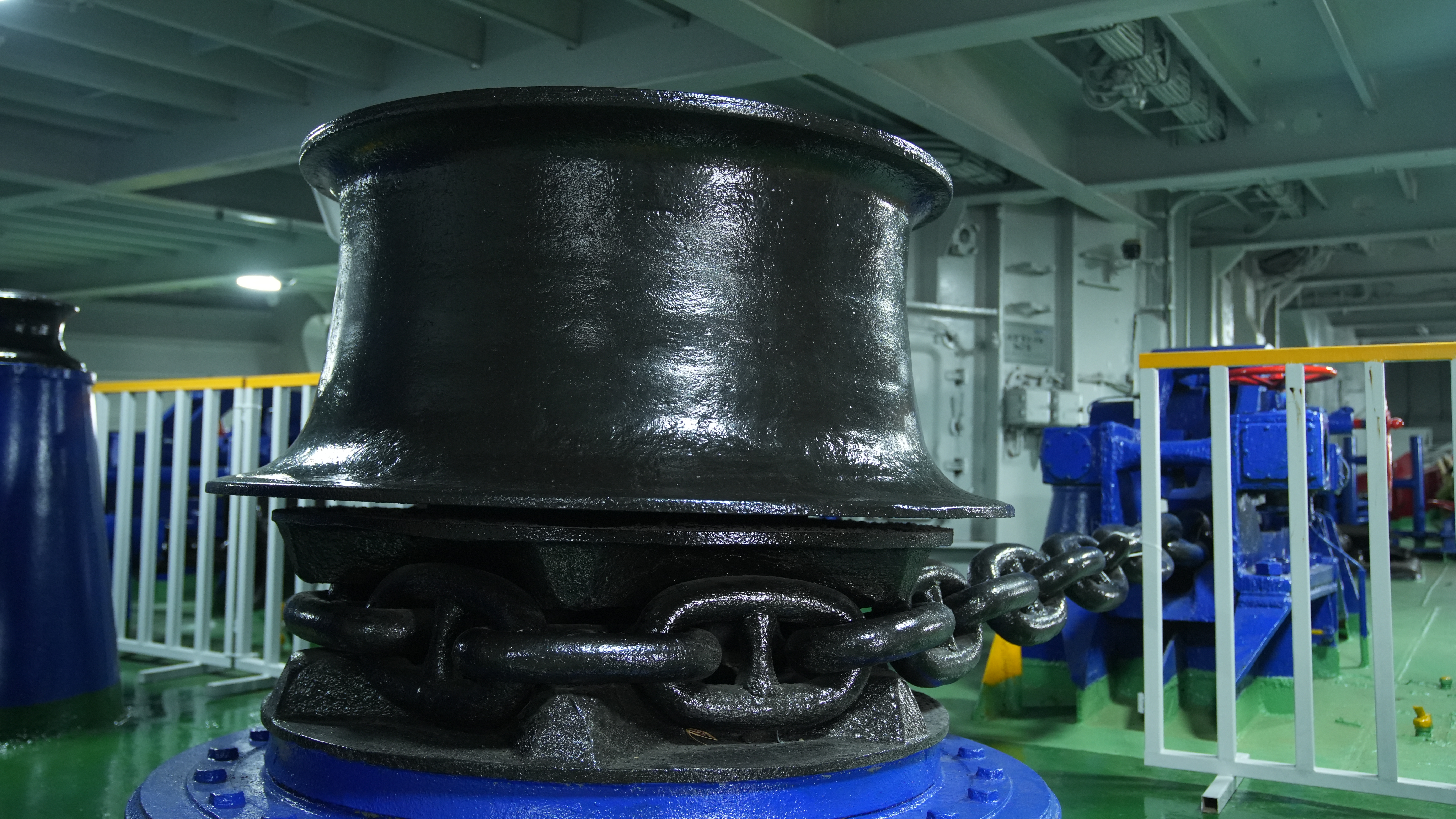 錨纜艙位于二甲艦艏,用于航母???、系纜和放錨等。艙內(nèi)還設(shè)有76 火炮彈藥庫、原艦印刷廠、傾斜水兵艙和火箭式深水炸彈彈藥庫等。