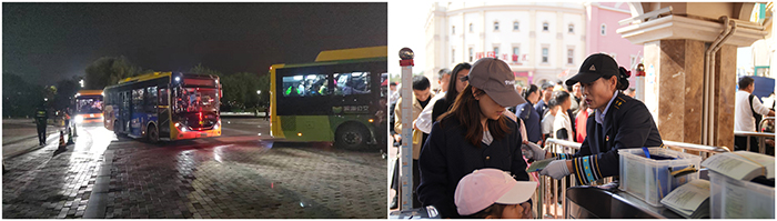 國慶期間,泰達航母多措并舉,致力于為游客提供滿意服務。尤其針對夜場游客疏散問題,景區在園區內外共設置接駁車、夜場定制公交70余輛,全方位為游客提供更加便捷的交通服務,共同保障游客散場出行。此外,景區4600余個停車位、6個線下售票窗口、11個檢票口全面開啟,滿足游客快速停車、購票、入園剛性需求。節日期間,景區服務人員、安保人員增加至近1300人。景區還與公安、消防、交通、醫療等多部門緊密協作、通力配合,全方位為游客提供安全、舒適旅游服務保障。