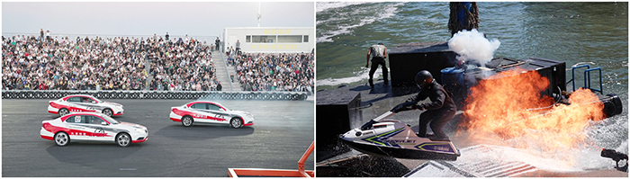 王牌演出《航母風暴》《飛車特技》中秋期間加場上演,表演場內高朋滿座、歡呼陣陣。《極限追逐》再度成功挑戰12米高的摩天輪大轉環,此外還有高速旋轉漂移、雙車追逐等高難度車技挑戰,為游客帶來了一場充滿速度、勇氣與激情的賽車之旅。