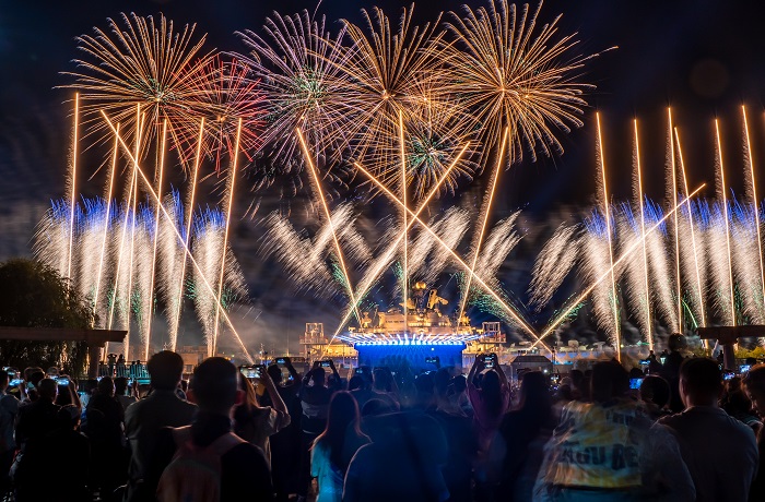 2023年,泰達(dá)航母搶抓文旅復(fù)蘇大勢,深入挖掘航母夜經(jīng)濟(jì)潛力,大力推動旅游消費(fèi)提質(zhì)升級,傾心打造了大型沉浸式音樂舞臺焰火秀項目,開展“夜上津門·焰遇航母”夏日焰火音樂節(jié)活動,真正開啟航母“白+黑”旅游新模式,促進(jìn)航母游熱度直線攀升,航母抖音官方號更是多次登頂抖音天津市團(tuán)購帶貨總榜第一名、天津景點(diǎn)收藏榜第一名、熱銷榜第一名,“焰遇航母”一躍成為享譽(yù)京津冀地區(qū)優(yōu)質(zhì)焰火秀演出項目。中秋國慶期間,還升級打造了“國慶特別版”大型無人機(jī)焰火秀,再度掀起夜場新高潮。全年19場焰火秀演出共吸引游客22.16萬人次,較疫情前2019年同期增長28%。